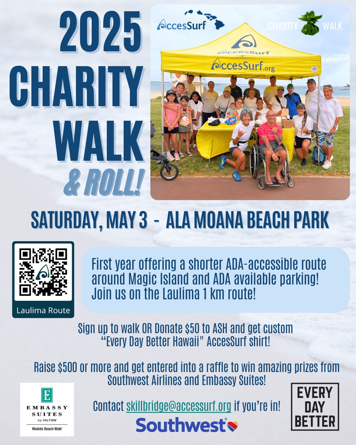 We are stoked you’re joining our AccesSurf Hawaii team for the 2025 Visitor Industry Charity Walk (& Roll!) on Saturday, May 3 at Ala Moana Beach Park!