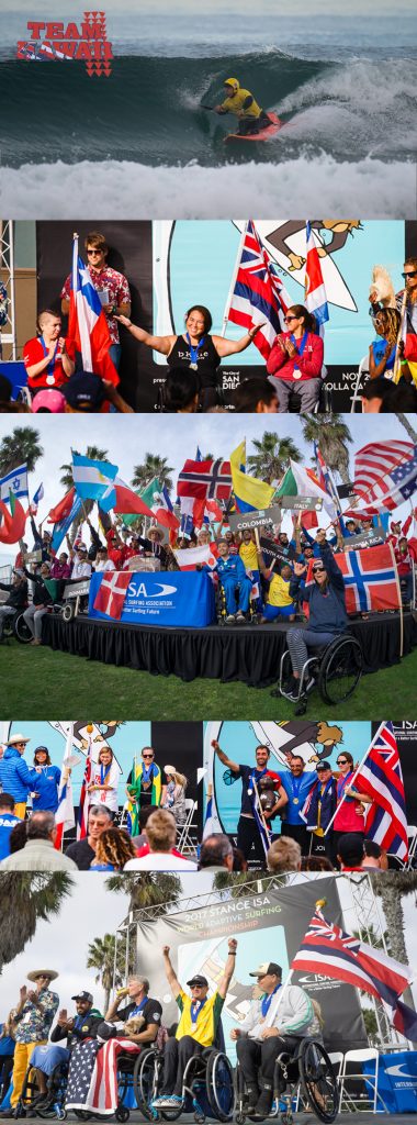 The 2017 ISA (International Surfing Association) World Adaptive Surfing Championships was held in La Jolla Shores CA. 109 surfers with disabilities from 26 nations competed in the 4 day competition. This was a historical event as this year marked the first for the ISA to include women’s divisions with the ISA World Adaptive Surfing Championships. Hawaii won 4 medals in the women’s divisions including 2 Gold medals. Adaptive surfers (surfers with physical disabilities) compete in 6 divisions – AS1 (Stand/Kneel), AS2 (Stand/Kneel), AS3 (Sit), A4 (prone), A5 (prone) and V1 (visually impaired). The ISA has modeled their world championships after AccesSurf’s Hawaii Adaptive Surfing Championships at Duke’s OceanFest.