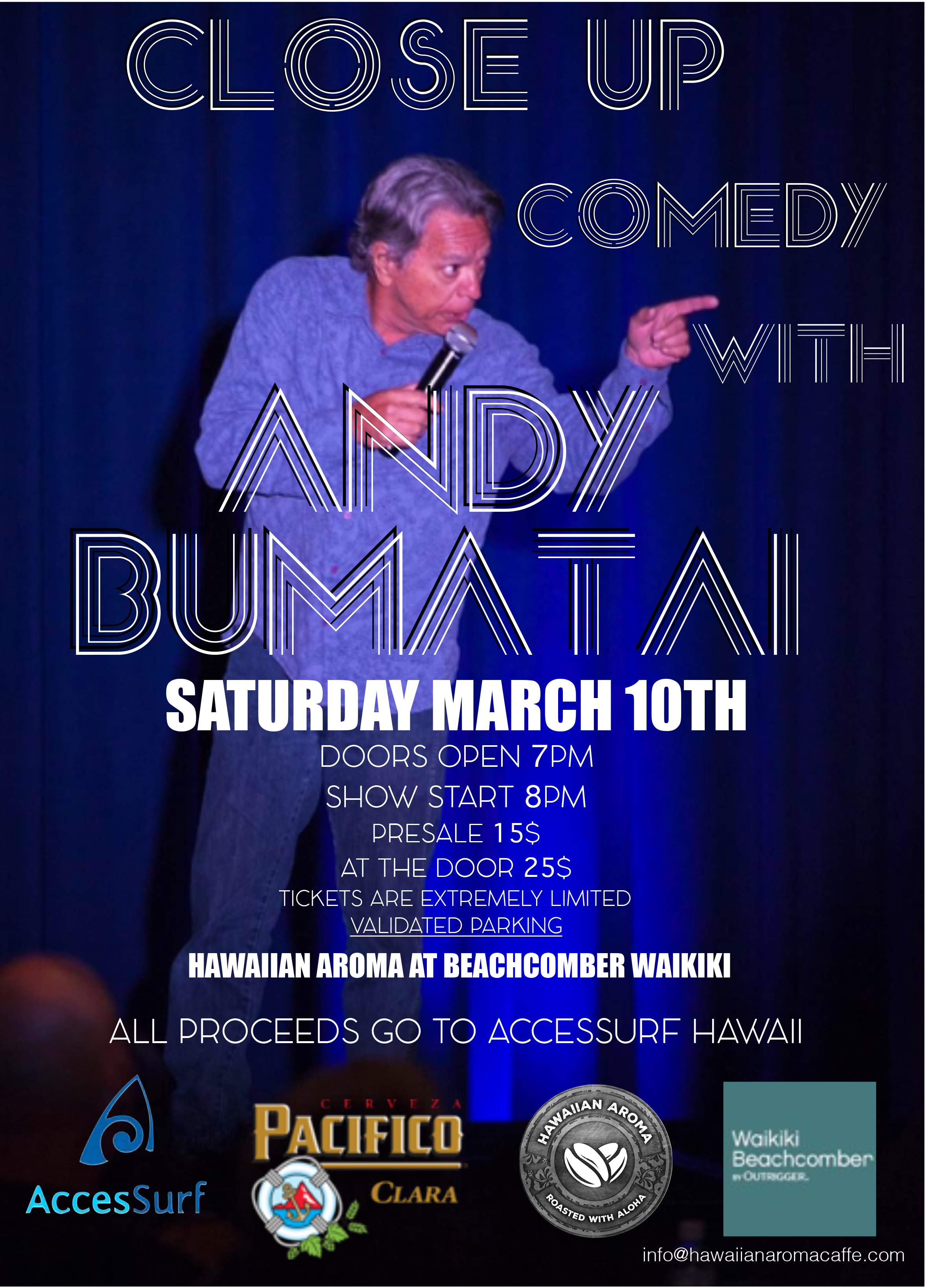 We are excited to share that Hawaiian Aroma Caffe at the Beachcomber Hotel in Waikiki will be hosting an evening with local comedian Andy Bumatai, with proceeds going to AccesSurf.