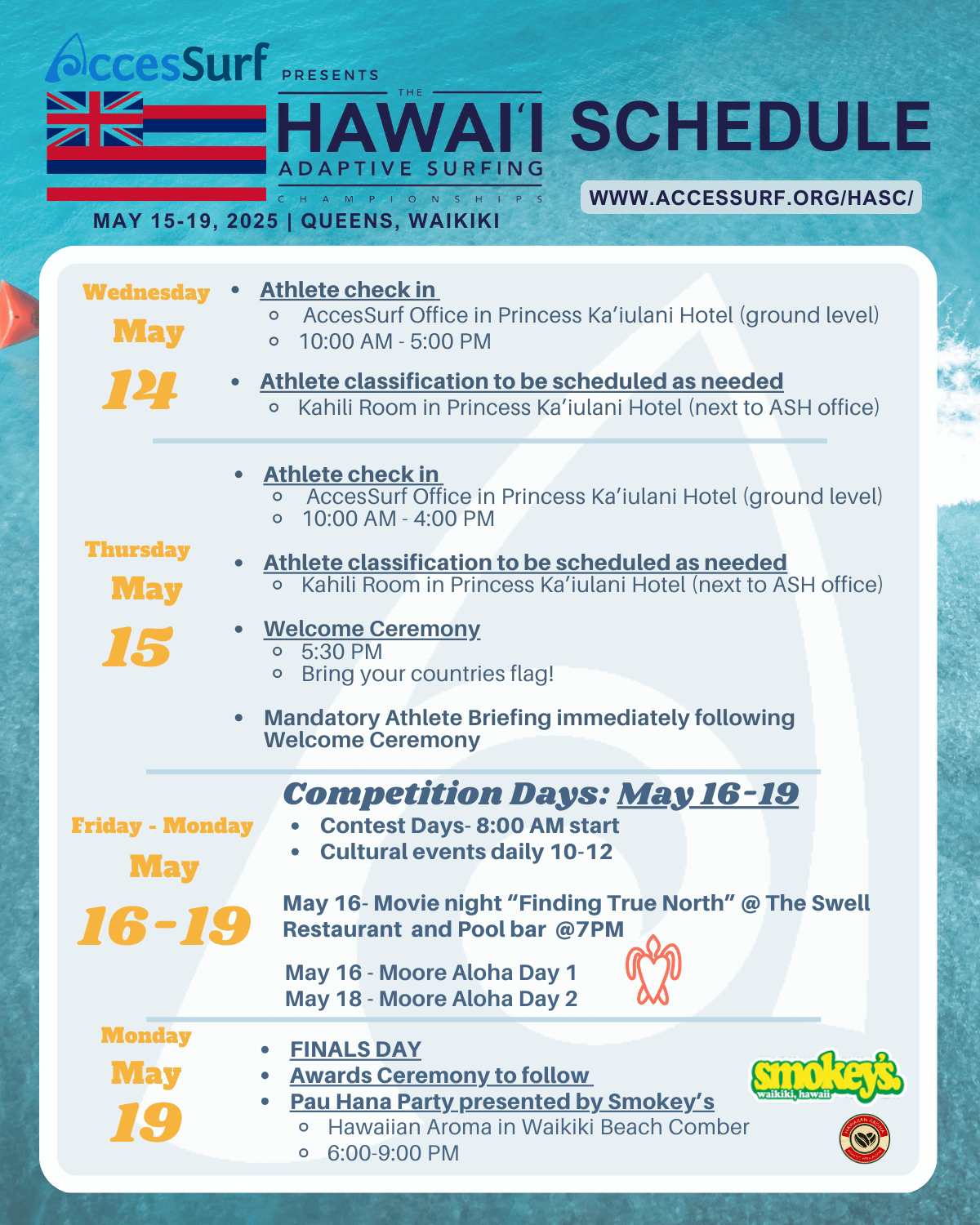 HASC is an AASP World Championship Tour event. AASP events require AASP memberships, meaning that in order to participate in any tour event, you must be a member of the Association of Adaptive Surfing Professionals (AASP). You can sign up for a single-event membership of $40 if you’re only planning to compete in one event, or an annual membership of $100 if you plan to participate in multiple AASP tour events. If you have questions or concerns regarding the single-event membership for HASC please contact us at info@accessurf.org