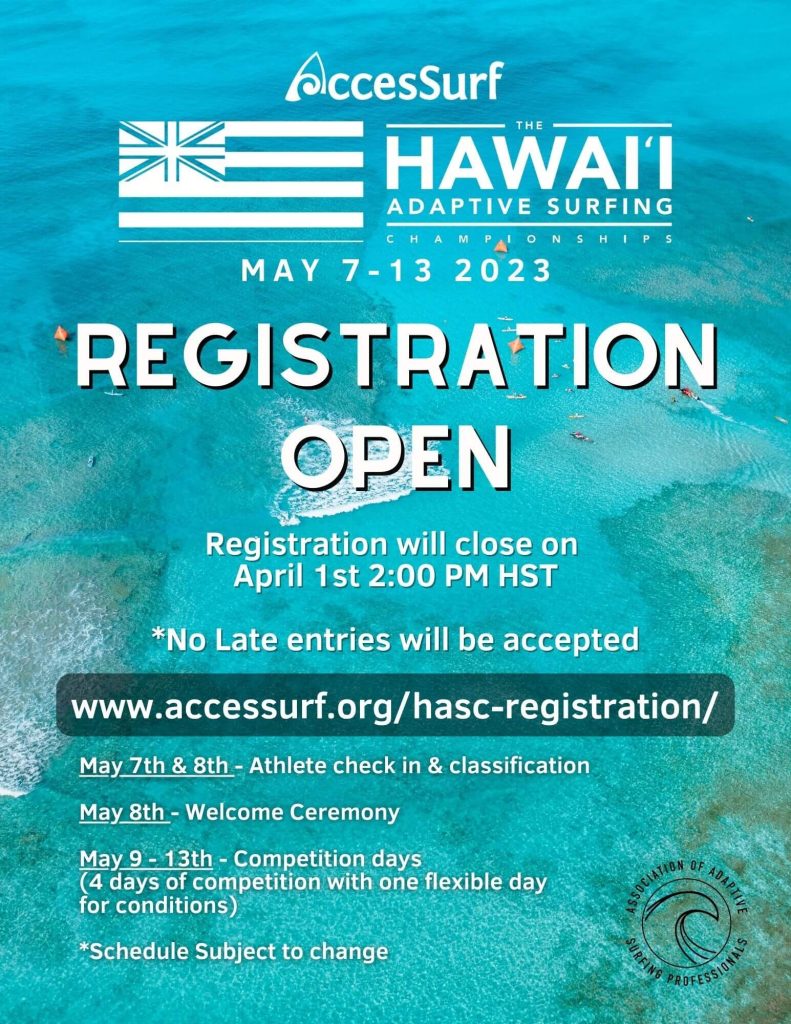 HASC is an AASP World Championship Tour event. AASP events require AASP memberships, meaning that in order to participate in any tour event, you must be a member of the Association of Adaptive Surfing Professionals (AASP). You can sign up for a single-event membership of $40 if you’re only planning to compete in one event, or an annual membership of $100 if you plan to participate in multiple AASP tour events. If you have questions or concerns regarding the single-event membership for HASC please contact us at info@accessurf.org