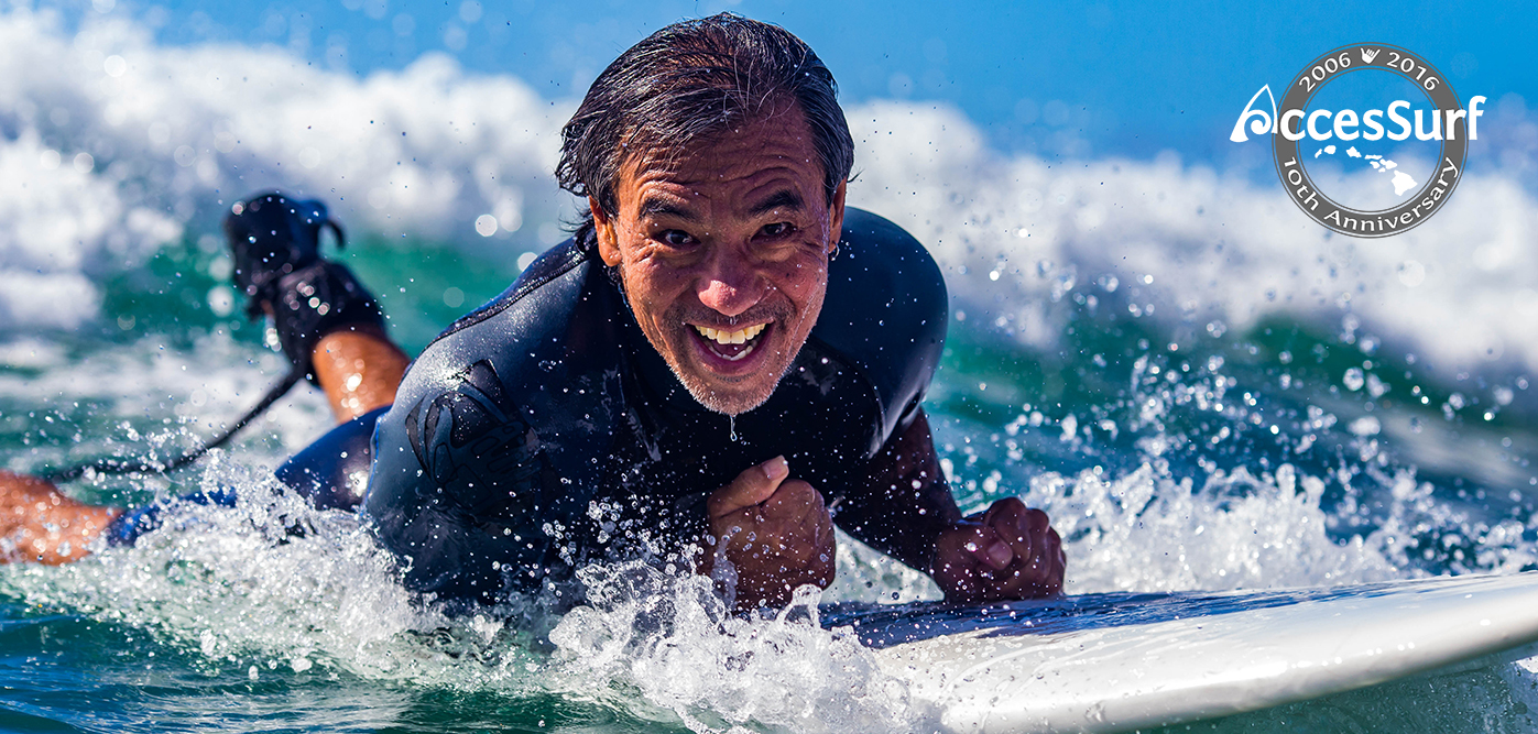 Aloha. I am Buster Kawasaki. I have been participating in AccesSurf’s Events for 2 years now – including the Swim Clinics, Wounded Warrior Day at the Beach, and my favorite … Day at the Beach!