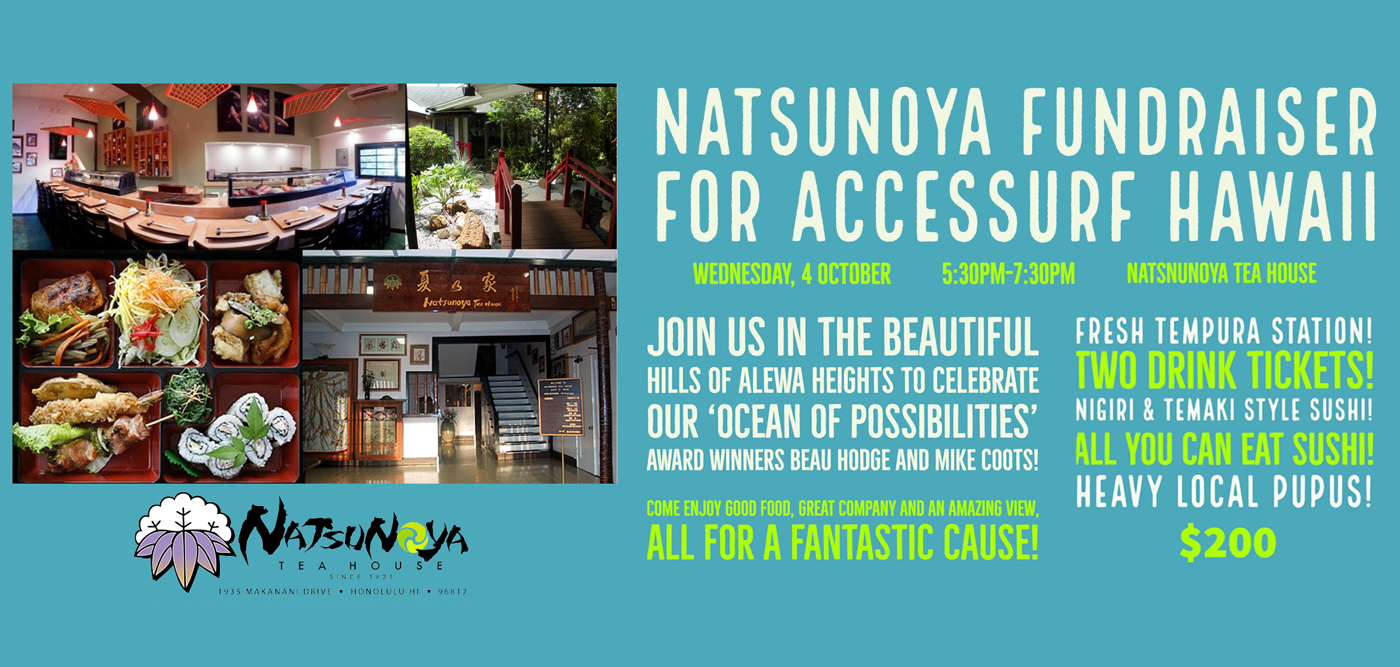 - Tickets can be purchased online HERE (please make the notation ‘Natsunoya Fundraiser’) or by check to ‘AccesSurf’ mailed to: PO Box 15152, Honolulu, HI,96830