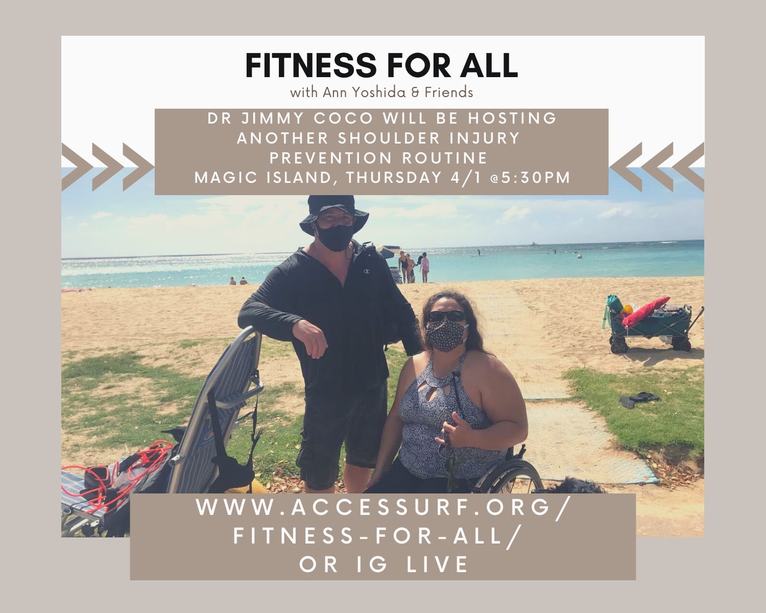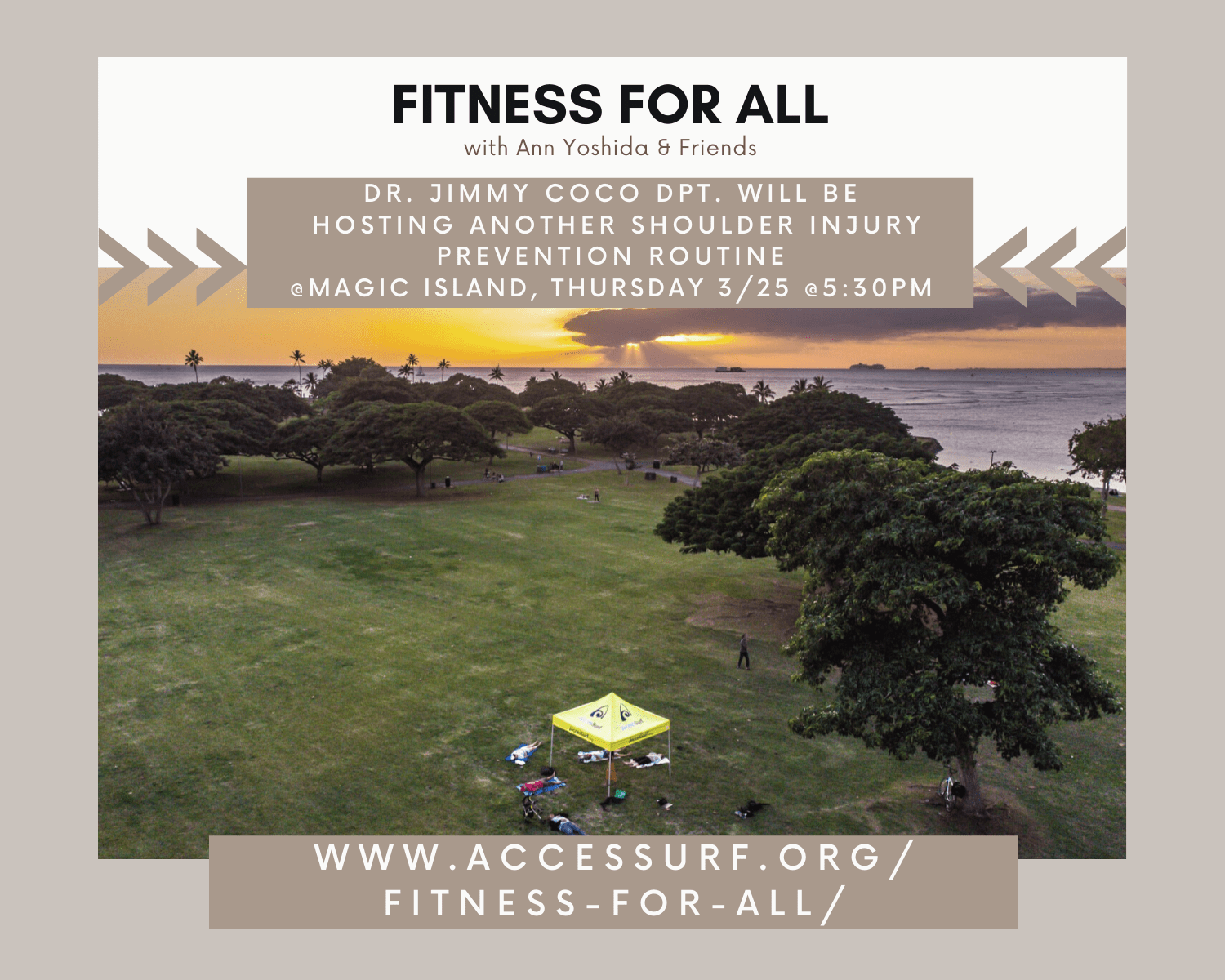 April 1, 2021 @ 5:30 pm - 6:30 pm Fitness For All – Jimmy Coco Shoulder Injury Prevention Ala Moana Regional Park Magic Island Fundraising Event